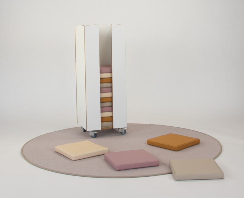 Verrijdbare trolley met 16 kussentjes in kunstleer gestoffeerd.